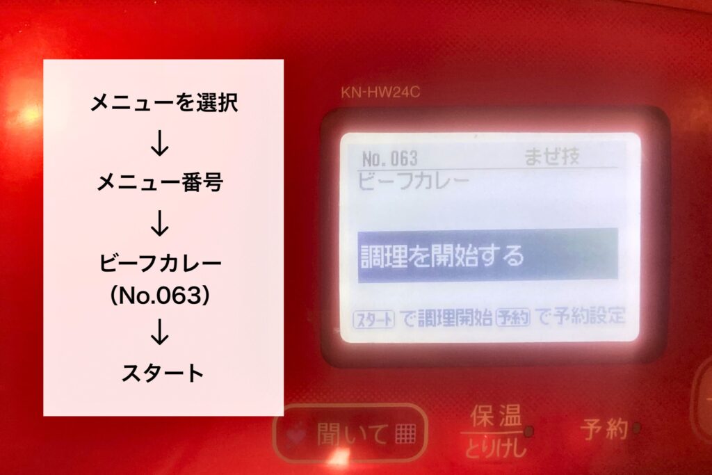 メニューを選択 → メニュー番号 → ビーフカレー(No.063) → スタート!
